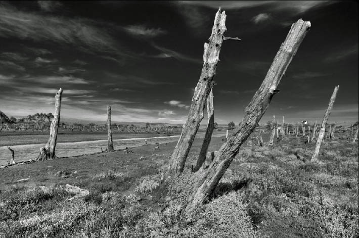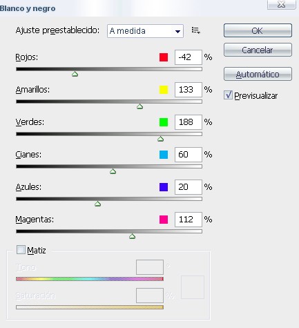 Trabajamos la fotografía para dar unos tonos al cielo similares a utilizar un filtro rojo intenso con película en blanco y negro; por lo tanto aumentamos los valores en los rojos y amarillos y los disminuimos en los azules.