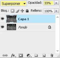 Duplicamos la capa (Ctrl-J), ponemos el modo de fusión en superponer y la opacidad hasta que conseguimos el resultado de volumen y contraste que necesitamos. En este caso hemos dado una opacidad del 33%.