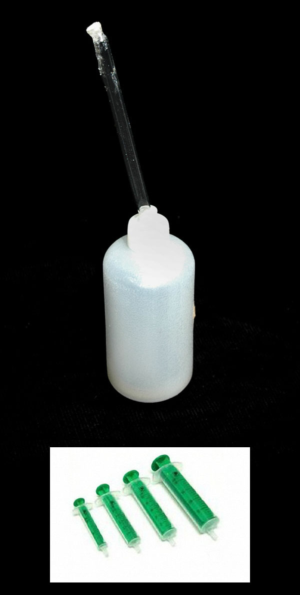 La forma de aplicar el pegamento químico, el cuál se encuentra en estado líquido, es mediante jeringas o con un artilugio de construcción casera como el que muestro a continuación; el artilugio lo he construido con un bote para agua de colonia de los que venden en las droguerías y la cánula de un cuentagotas.