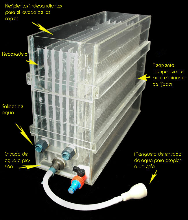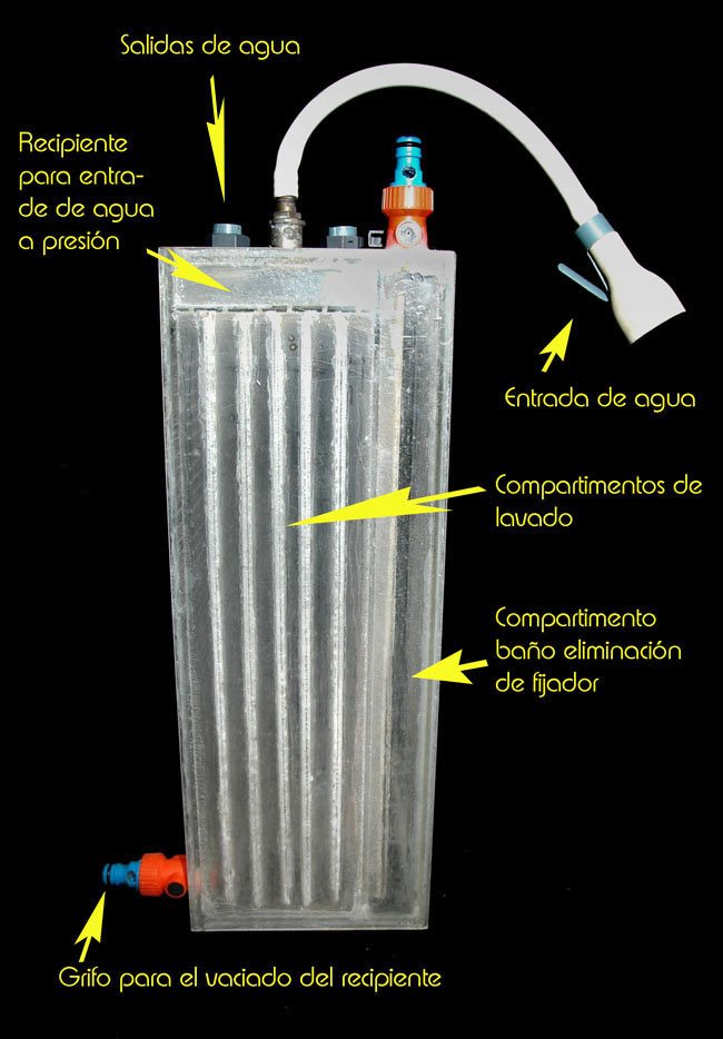 Se puede observar las partes de la lavadora, en la cual he incluido un recipiente especial para un baño eliminador de hiposulfito (fijador).
