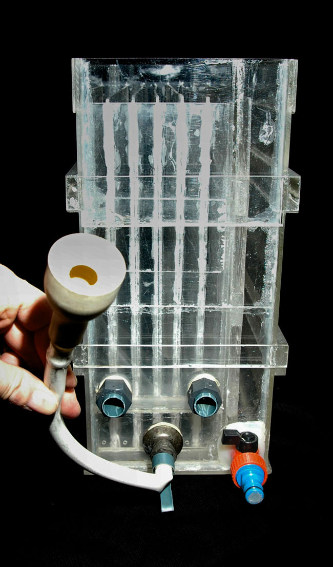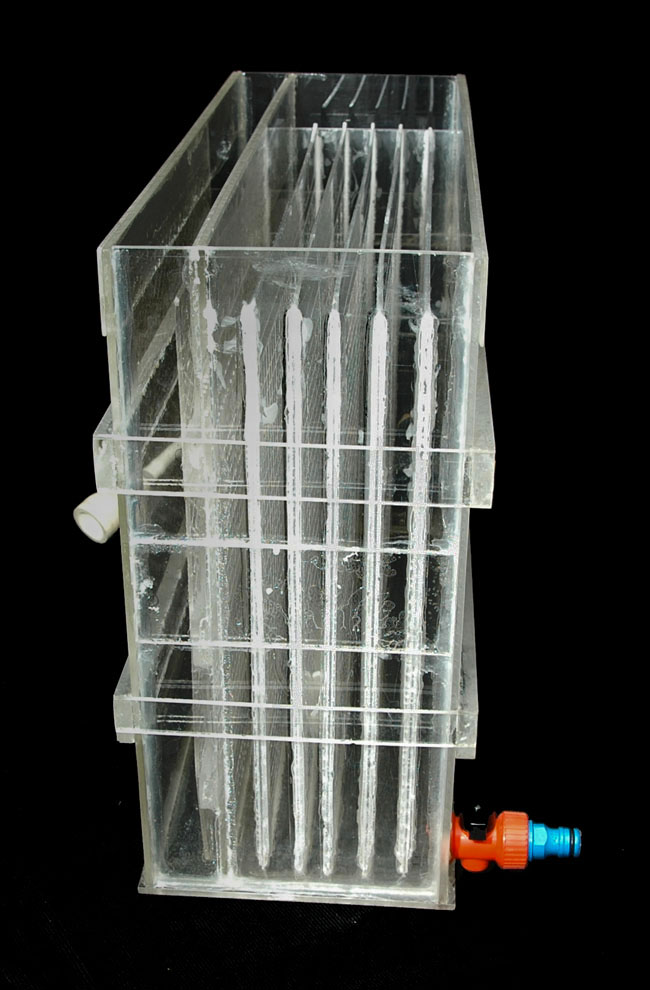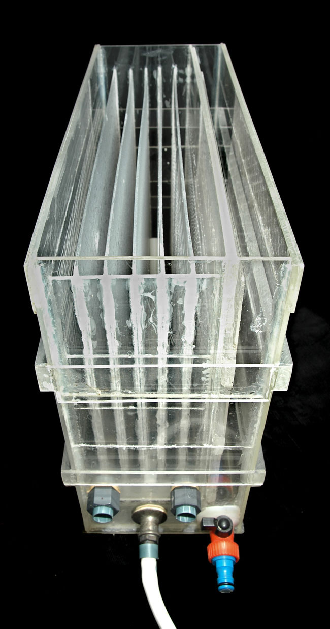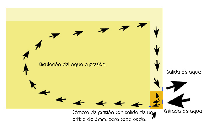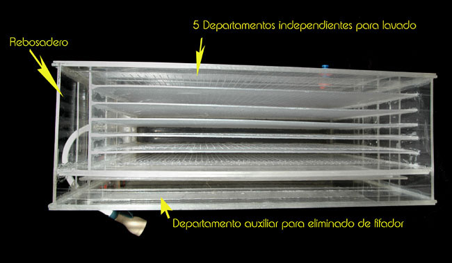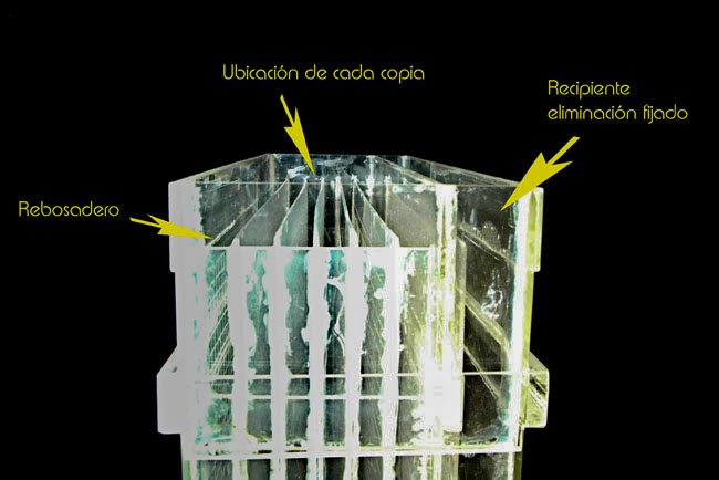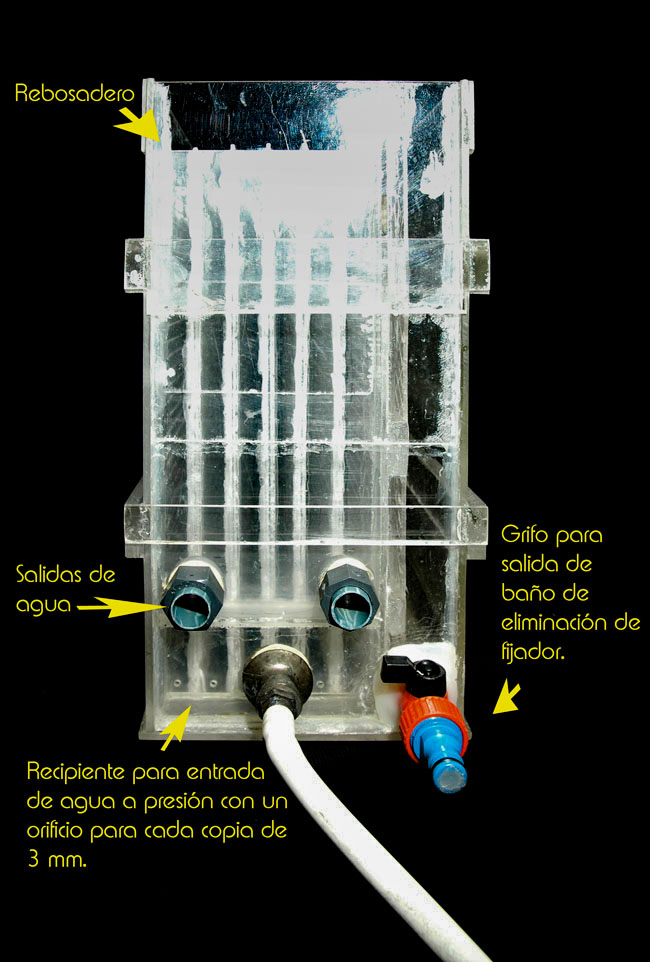 En el siguiente esquema, vemos el funcionamiento de la lavadora. El agua entra hasta una pequeña cámara con una salida de un agujero de 2 ó 3 mm. aproximadamente para cada celda; en el caso de mi lavadora, tengo 5 paneles separadores y por lo tanto 6 celdas para el lavado de 6 copias.