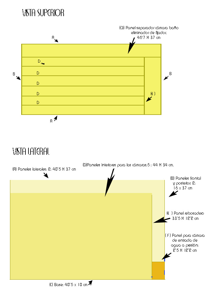 A continuación muestro las imágenes de mi lavadora con las medidas y su funcionamiento. Para construir vuestra lavadora debéis de realizar un croquis basándose en la mía; si el tamaño a lavar es para copias de hasta 30 X 40 cm., podéis utilizar las medidas que yo he utilizado.